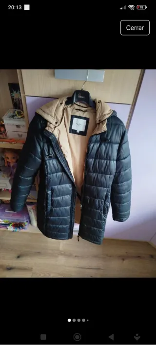 Plumífero acolchado de buena calidad. Cierre de cremallera. Cuello alto. Bolsillos laterales con cremallera. Capucha desmontable y el pelo también se puede quitar. En una de las fotos se puede apreciar ligeramente unas marcas d costura porque tenía unos botones de cuerno pero se los quité, no se nota apenas. Lo vendo porque me queda ya pequeño pero está muy bien conservado y abriga mucho.