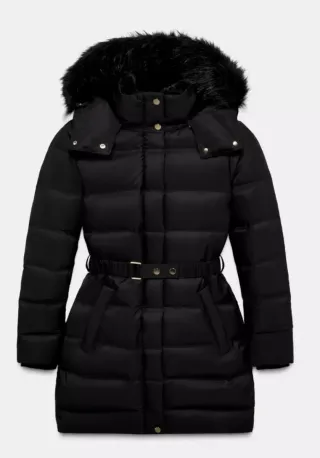 Abrigo de mujer de Zara con capucha y pelo. - Diseño acolchado. - Cierre de cremallera. - Bolsillos laterales.