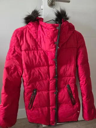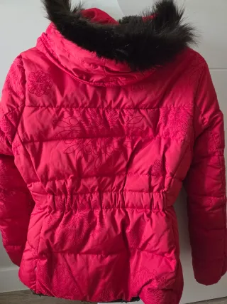 Abrigo acolchado de invierno con capucha forrada de pelo sintético. - Cierre de cremallera y botones a presión. - Bolsillos laterales. - Puños elásticos. Apenas se ha usado 3 veces