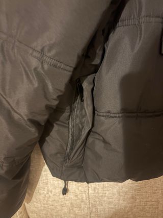 Plumífero acolchado con capucha. - Diseño con cremallera frontal. - Bolsillos laterales con cremallera. - Acabado brillante. - Talla M. pero no da mucha talla - Tiene un pequeño enganche (ver foto).