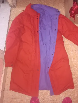 Abrigo largo de plumífero con un diseño reversible en dos colores. - Exterior en color rojo. - Interior en color morado.