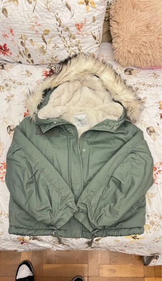 Chaquetón acolchado de Bimba y Lola, perfecto para el invierno. Es de color verde oliva y tiene un cuello de borreguito muy suave. Usado tres veces, está nuevo. - Diseño acolchado. - Cuello de borreguito. - Largo por debajo de la cadera.