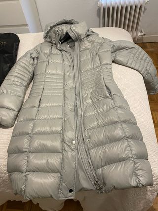 Plumifero nuevo color turquesa hasta la rodilla. Es talla XS , pero para una S-38 talla. capucha muy amplia. Precio en tienda 165€ puesto en dos ocasiones La ultima foto es en otro color , la subo para que se aprecie bien modelo .