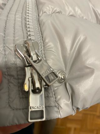 Elegante plumífero largo de la marca Escada. Corresponde a una S Con funda para guardar - Diseño acolchado. - Capucha integrada. - Cierre de cremallera y botones. - Bolsillos laterales.
