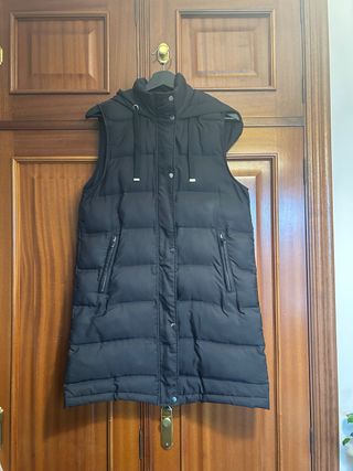 Chaleco largo acolchado de Zara. - Diseño sin mangas. - Capucha integrada. - Cierre de cremallera y botones a presión. - Bolsillos laterales con cremallera.