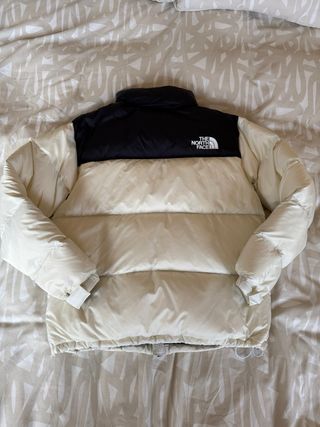 Chaqueta plumífero The North Face Nuptse con diseño bicolor. - Parte superior negra. - Parte inferior blanca. - Logo de The North Face en el pecho.