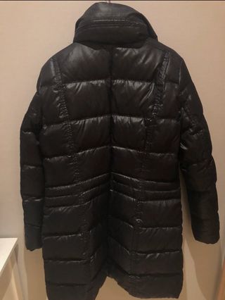 Abrigo largo acolchado con capucha de pelo.Relleno de plumas y forro interior con pelito en la capucha y desde los hombros a mitad de la espalda para mayor calidez. Es una talla 38 pero talla como M o 40,la que yo uso habitualmente. - Cierre de botones dorados. - Cintura ajustable con cordón. - Bolsillos con solapa.