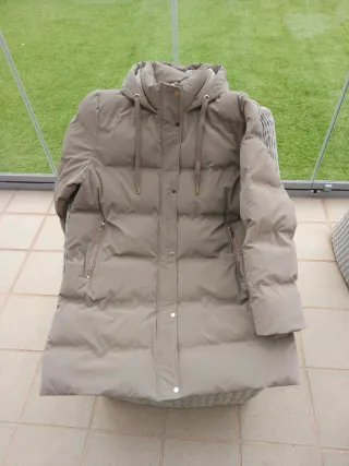 Abrigo acolchado de Zara en color beige. Es un plumífero ligero y cálido, perfecto para el día a día. Tacto muy agradable. Tiene una Capucha oculta con cremallera. Muy buena calidad. Falta cinturón pero queda mejor sin él. - Detalle de pelo por dentro del cuello. - Cierre de cremallera. - Bolsillos laterales con cremallera. Atención, es talla M pero da poca talla, yo uso la M y me está muy justo. Pruébatelo sin compromiso. Mide 80 cm desde el hombro hasta abajo.