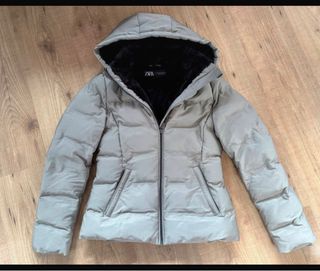 Plumífero de la marca Zara en color gris. - Diseño acolchado. - Capucha. - Cierre de cremallera.