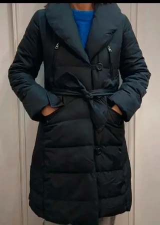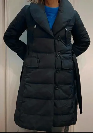 Elegante plumífero largo. Sirve para una talla M también - Diseño acolchado. - Cinturón para ajustar. - Cuello amplio. - Cierre de botones y cremalleras.