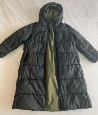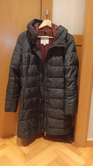 Abrigo largo tipo plumífero de Zara. Es una prenda cálida y cómoda. - Diseño acolchado. - Cierre de cremallera. - Capucha integrada.