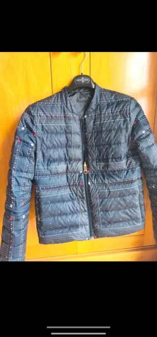 Chaqueta de plumón azul marino con estampado de estrellas rojas, blancas y beige. Reversible. Dos bolsillos con cremallera y dos interiores de plastón. Talla M, medidas 40 cm de hombros, 50 de sisa y 57 de largo. Ligero y cálido. Impecable, como nuevo. Comprado en el corte inglés por 150€.