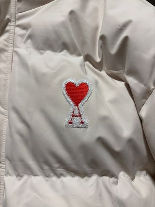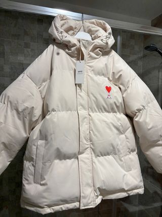 Plumífero con capucha, perfecto para el frío. Cierre cremallera y click. Talla XL. Nuevo con etiquetas - Color beige. - Diseño acolchado. - Logo de corazón rojo bordado en el pecho.