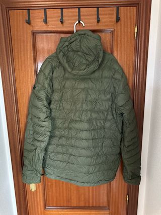 Talla S 80% plumón 20%pluma Abrigo plumífero con capucha en color verde oscuro. Perfecto para mantenerte abrigado. - Diseño acolchado. - Cierre de cremallera frontal. - Capucha integrada.