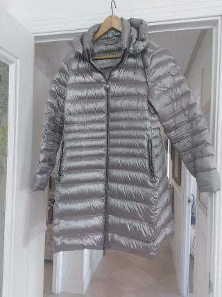 Abrigo plumífero largo de la marca de alta gama Henry Arroway en color gris plata. La capucha es desmontable, cremallera doble. Logo en manga y cremallera. Medidas: Largo 85, Sisa a sisa 56, Espalda 42 -