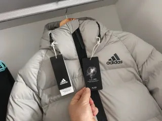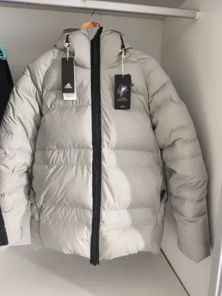 Chaqueta de plumón Adidas en color gris, talla M. Perfecta para mantenerte abrigado. - Diseño acolchado. - Cremallera frontal. - Capucha integrada.