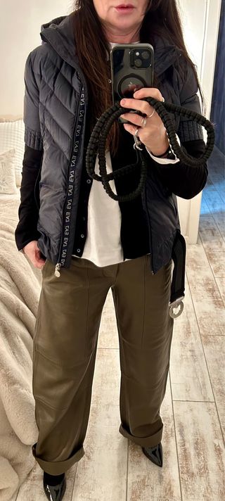 Chaqueta plumífera de EA7 Emporio Armani, la línea de ropa deportiva de lujo de la marca italiana. Se caracteriza por un diseño acolchado en color negro con mangas cortas, una capucha ajustable y una cinta con el logotipo "EA7" que recorre el borde de la cremallera.