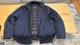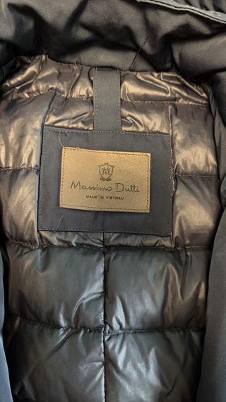 Abrigo de hombre de la marca Massimo Dutti en color azul. Es un abrigo con relleno 100% pluma, acolchado con capucha. - Cierre de cremallera. - Bolsillos laterales con cremallera. - Capucha ajustable. Precio nuevo: 160€