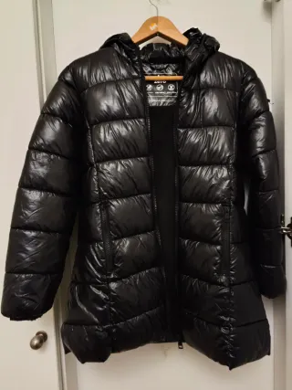 Plumas negro con capucha. Cierre cremallera. La talla es XS pero da bastante talla. Yo suelo usar una M. Puños con elástico. Muy calentito y en perfecto estado. Largo a mitad de muslo.Se entrega/envía recién salido de la tintorería.