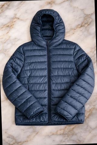 Chaqueta tipo plumífero ligero de Terranova, color azul marino con capucha. Muy práctica para entretiempo e invierno suave: abriga sin pesar y se puede llevar a diario. Cierre de cremallera, acolchado horizontal y acabado brillante. En muy buen estado (ver fotos de detalles, etiqueta y medidas con cinta). Ideal para looks casual, viajes o para llevar en La mochila por lo poco que ocupa. #plumifero #chaqueta #terranova #azulmarino #capucha #acolchado #invierno #entretiempo #abrigo #modahombre #modamujer