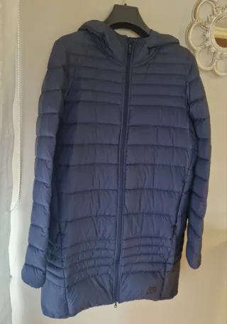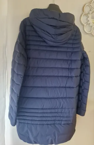 Abrigo largo de plumas para mujer, en un elegante tono azul marino. Perfecto para mantenerte abrigada con estilo. - Diseño acolchado horizontal. - Capucha con detalle de pelo. - Cierre de cremallera y botones. - Puños elásticos. abrigo muy caliente de pluma natural en su momento costó más de 100 € y está sin usar prácticamente
