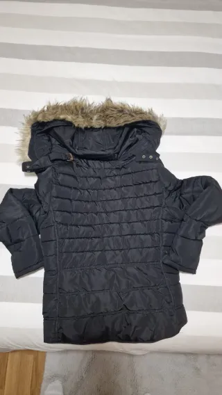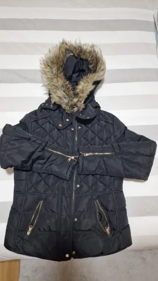 Abrigo acolchado de Zara con capucha de pelo. Muy calentito, relleno de plumas de pato e interior y capucha de pelo suaves. - Relleno de plumas de pato. - Forro interior de pelo sintético. - Cierre de cremallera. - Bolsillos laterales con cremallera. - Capucha con pelo sintético desmontable.