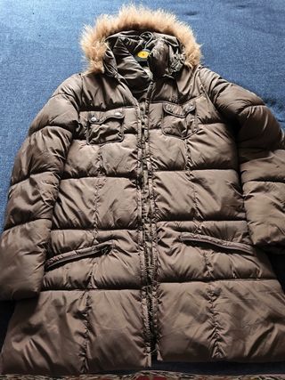 Chaqueta plumífera de color marrón con capucha de pelo sintético. - Cierre de cremallera. - Dos bolsillos superiores con solapa y corchetes. - Dos bolsillos inferiores con cremallera. Está nueva. Sin roturas ni enganches. Muy calentita. Sienta de maravilla. Recoger en Vigo