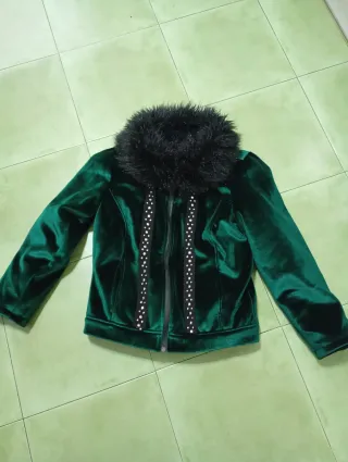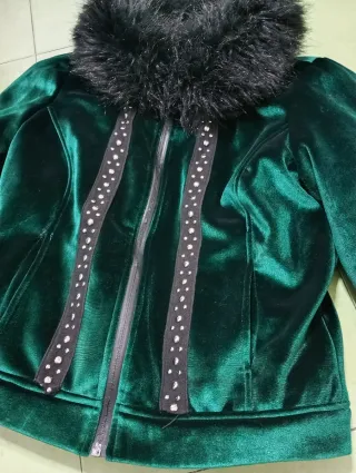 Chaqueta de terciopelo con un diseño elegante y forro interior. En perfecto estado - Material: Terciopelo. - Cuello con pelo sintético negro. - Adornos de pedrería en la parte frontal.
