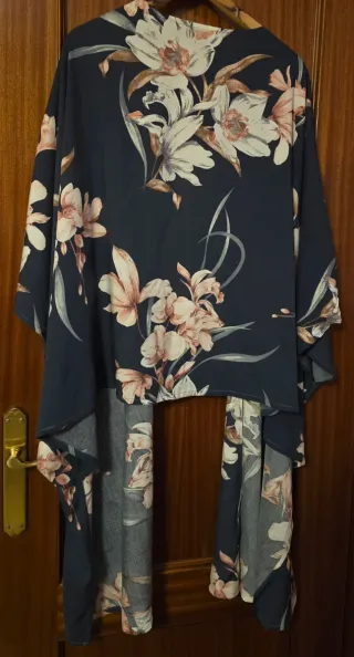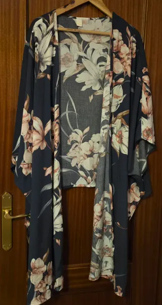 Kimono ligero con estampado floral en tonos grises y rosados. Su diseño abierto lo hace muy versátil. - Estampado de flores grandes. - Diseño abierto sin cierres. - Mangas amplias.