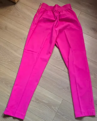 Pantalón de vestir de color rosa vibrante. Diseño elegante y moderno. - Cintura alta. - Pierna recta. - Bolsillos laterales.