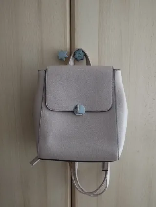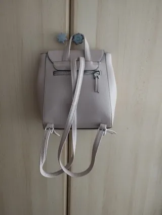 Mochila de color rosa palo de 27cm de alto y 25cm de ancho. Con cierre con solapa y broche metálico y por debajo una cremallera. Con un bolsillo en la espalda de 16x11cm y un bolsillo interior de 16x14cm, ambos con cremallera . Con las correas ajustables (tipo mochila) El exterior imita a la piel y por dentro, el bolsillo, es de tela. Solo me la he puesto una vez. Para cualquier medida o duda preguntad sin compromiso.