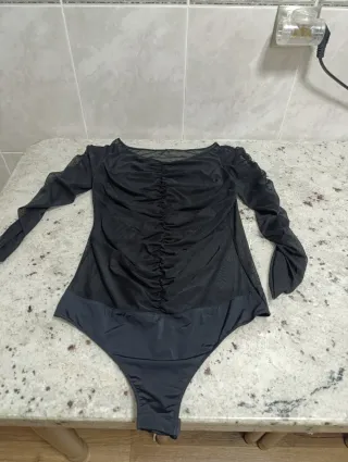 Body transparente con detalle fruncido en el delantero. La parte inferior es opaca. - Mangas largas. - Diseño elegante y moderno.