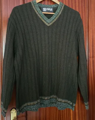 Jersey de punto con cuello en V y detalles en la parte inferior. - Diseño de canalé vertical. - Ribete decorativo en cuello y bajo. - Tejido de punto suave.