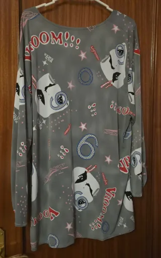 Camiseta de manga larga con un diseño llamativo y moderno. El estampado presenta caras estilizadas, números y la palabra Vroom en rojo y blanco. - Diseño gráfico multicolor sobre fondo gris. - Cuello redondo. - Manga larga.