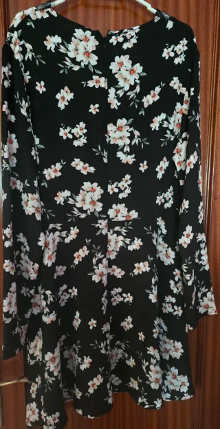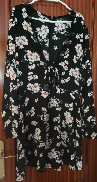Vestido con estampado floral en tonos negros y rosas. Presenta un escote en V con detalle de encaje y lazada. - Manga larga. - Largo hasta la rodilla. - Cierre de cremallera.