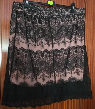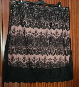 Elegante falda con un diseño de encaje superpuesto. - Encaje negro detallado. - Forro interior en color rosa. - Largo hasta la rodilla.