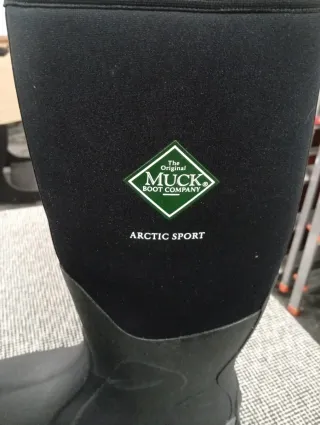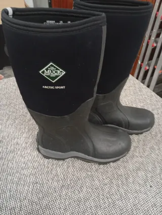 Botas de agua Muck Boot Company modelo Arctic Sport. - Color principal negro con detalles en gris. - Diseño alto para mayor protección.Auque es un 44-45 sería para un 43-44. Solo me las puse una hora.