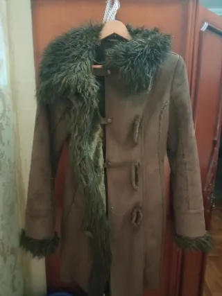 Abrigo largo con un bonito acabado efecto ante y detalles de pelo.Doble cierre. Es muy calentito.En muy buen estado ,solo está un poco más gastado el cierre del cuello pero no se ve(adjunto foto)