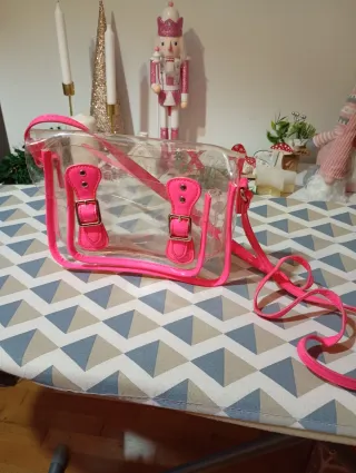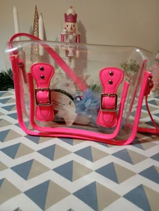 Bolso transparente con detalles en color rosa y en perfecto estado. - Medidas: 22 cm de largo por 17 cm de alto y 6 de ancho. La correa mide 118 cm de largo, tiene 4 agujeros para ponerlo más corto. - Material: PVC transparente. - Cierre con hebillas decorativas. - Correa ajustable para llevar al hombro o cruzado.