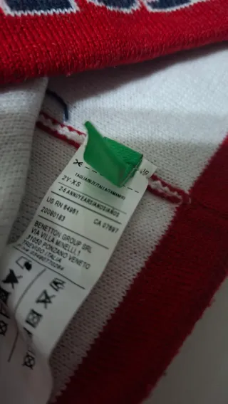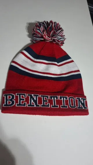 Gorro de invierno para niños con un diseño llamativo y pompon. - Diseño a rayas rojas, blancas y azul marino. - Detalle de pompon multicolor en la parte superior. - Banda con el logo BENETTON en contraste. Talla 2 años...(amplia)