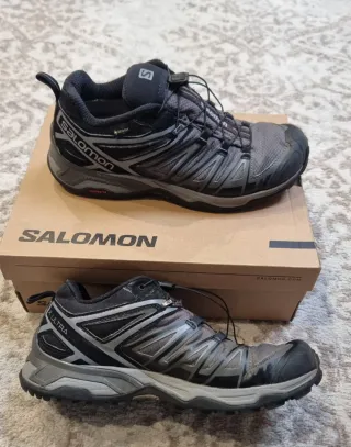 Zapatillas de senderismo Salomon en color negro y gris. Perfectas para tus aventuras al aire libre. - Membrana Gore-Tex para impermeabilidad. - Suela Contagrip para un agarre óptimo. - Sistema de lazada rápida. - Modelo X Ultra.