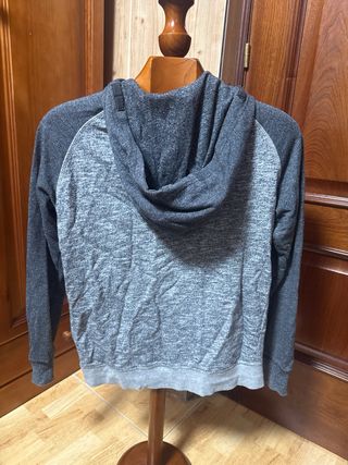 Sudadera con capucha y cremallera completa. Presenta un diseño jaspeado en dos tonos de gris. - Mangas raglán. - Bolsillos tipo canguro. En perfecto estado, se vende por renovación de armario.