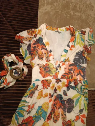 Vestido de verano con un vibrante estampado floral. Ideal para días soleados. - Diseño con escote en V. - Mangas cortas con volantes. - Incluye cinturón a juego con hebilla de madera.