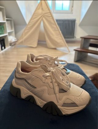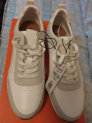Zapatillas deportivas de la marca de El Corte Inglés, talla 43, a estrenar. - Combinación de colores beige y blanco. - Diseño moderno y versátil.