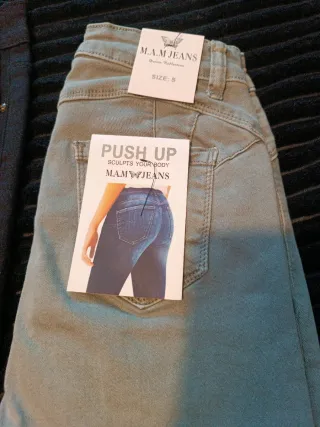 Vaqueros de tiro alto con un diseño que realza la figura. - Corte push up. - Tejido denim. - Cierre con cremallera y botón. Nuevo a estrenar con etiqueta detalle en el bajo de piedras