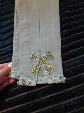 Vaqueros de color rosa con un diseño moderno y detalles únicos. - Adorno de lentejuelas y bordados en la parte inferior. - Efecto deshilachado en el bajo. - Etiqueta de la marca visible.
