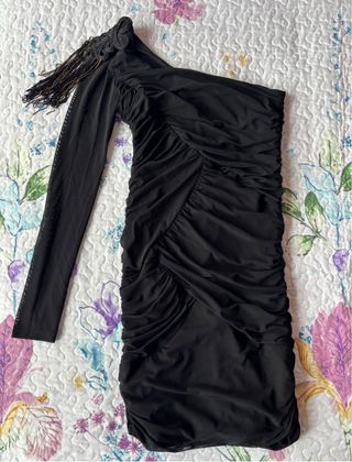 Elegante vestido corto negro con diseño asimétrico. - Un solo hombro. - Manga larga y transparente. - Detalle de volantes y drapeado. - Adorno en el hombro con flecos.