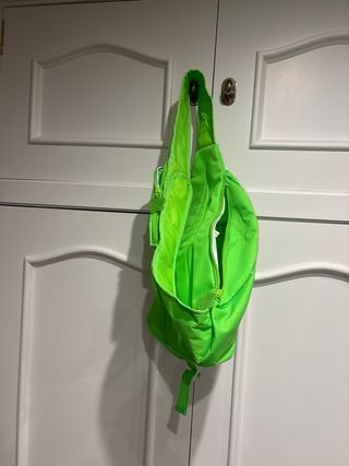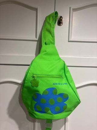 Mochila bandolera con un diseño divertido y llamativo. - Color verde brillante. - Estampado de nube azul con lunares verdes. - Cremallera frontal. - Colgante de flor. - Nombre de la marca visible.