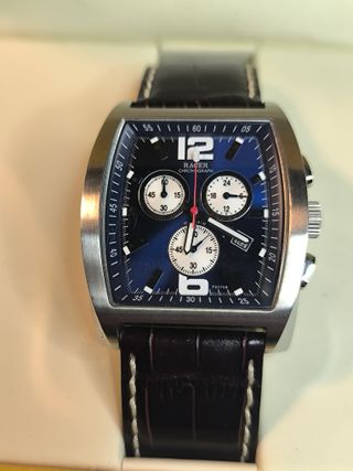 Reloj Racer de diseño rectangular con cronógrafo. Se entrega con su caja original y todos los accesorios. - Movimiento de cuarzo - Dimensiones 38 x 39 mm - Lug to Lug 46 mm - Caja y documentación - Esfera azul con detalles plateados. - Correa de piel. - Resistente al agua (ATM).