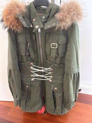 Abrigo de estilo militar en tono verde. Presenta un diseño con cordones en la cintura para un ajuste personalizado y detalles de hebillas. - Capucha con pelo desmontable - Puños abullonados con botones. - Bolsillos frontales con solapa.